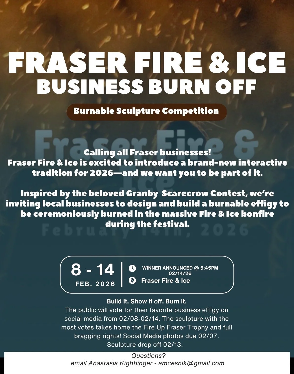 Inspired by the beloved Granby Scarecrow Contest, local businesses are invited to design and build a burnable sculpture or effigy that represents their business or creative spirit. Sculptures will be displayed during the Fire & Ice Festival, then ceremoniously burned in the massive Fire & Ice bonfire on February 14, 2026.